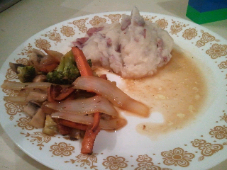 I was looking through my picture gallery to see if I had anything I could post, and I found one of dinner we made this past weekend. It was a small dinner, we'd run out of meat; but we had vegetables and Nick had bought a handful of red-skin potatoes. I fried the vegetables with sushi vinegar and soy sauce, and Nick mashed the potatoes with milk, butter, salt & pepper and garlic.